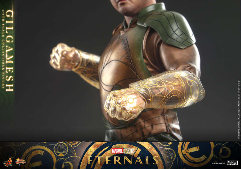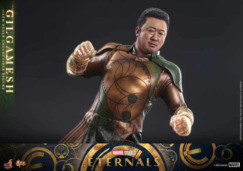 本作高約 30 公分,全身共計 30 處可動,根據劇中設定打造出青銅、金屬綠色搭配的永恆族戰衣,盔甲上頭的圖紋細節考究還原,並採用布料縫製的軟質護裙降低對腿部可動的干涉,壯碩的上身、雙臂充分形塑,展示起來極具魄力!頭雕部分十分出色,傳神地刻畫出演員「馬東石」的面部輪廓,眼神、皮膚紋理、剃過的鬍子都十分逼真,配件部分則是因應吉爾伽美什的能力設定,附上一對飾有金色線條的透明拳套特效。