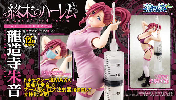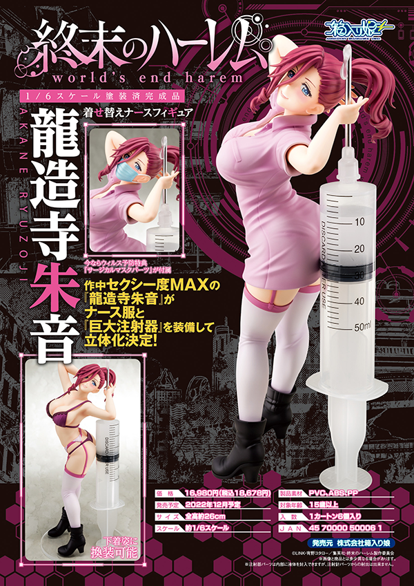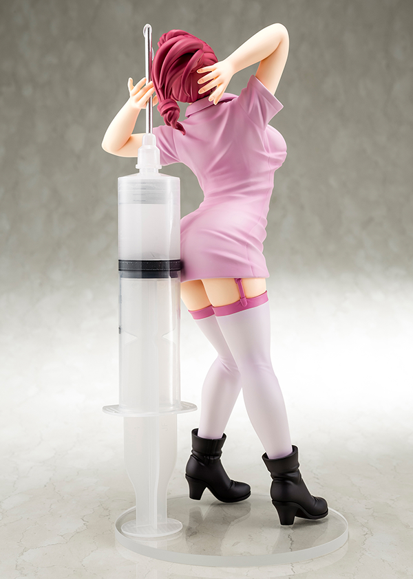箱入り娘「龍造寺朱音」1/6比例模型,將緊身護士服搭配巨大針筒的朱音立體化~尺寸全高達 26 公分,性感倚靠在針筒上的造型,展現出迷人的身形與豐滿的線條,搭配此系列特色的可脫換裝設計,能夠呈現不同分為的內衣穿搭,露出裙底的吊帶襪,盡情欣賞大膽的造型!另外,為營造真實感,針筒附有流出的透明疫苗特效件以及噴射的濁白疫苗特效件,只能說真的很會餒~