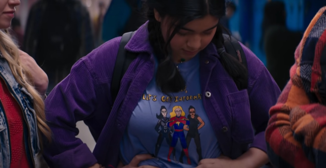 4. 復仇者同人T 身為一位復仇者聯盟的迷妹,卡瑪拉時常穿著復仇者聯盟圖案的服裝,這件被同學調侃的T恤就印有驚奇隊長、黃蜂女和女武神。由於女武神參與了終局之戰,繼承了新阿斯嘉的王位,因此現今是被世人廣為認識的。(在《蜘蛛人:無家日》中則有彩蛋提到,她所領導的新阿斯嘉面臨政變問題。)