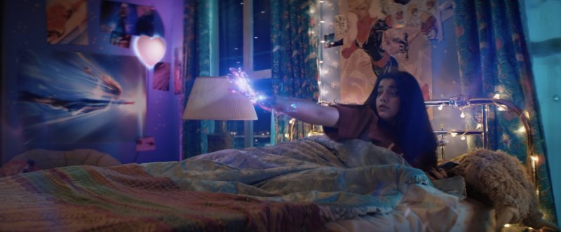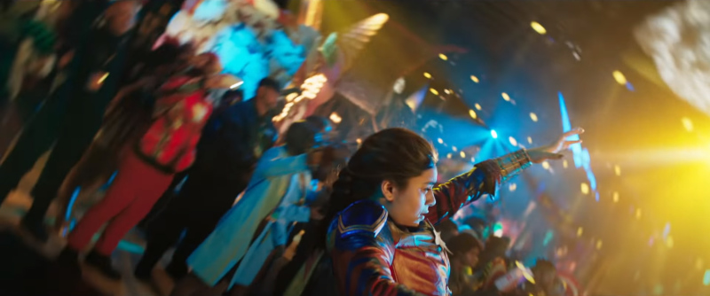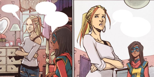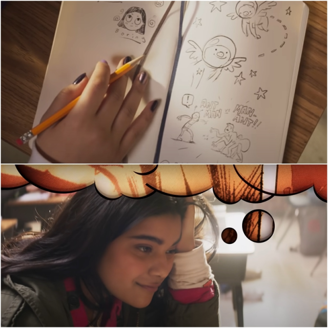 1. 白日夢 預告一開始可以看到「驚奇少女」卡瑪拉克汗 (Kamala Khan) 在學校做白日夢,還在筆記本上畫著蟻人等塗鴉。卡瑪拉是一位巴基斯坦裔穆斯林少女,沉迷於復仇者聯盟,尤其是對「驚奇隊長」卡羅丹佛斯癡迷。值得注意的是,在漫畫中「驚奇少女」是卡羅丹佛斯最初使用的稱號。