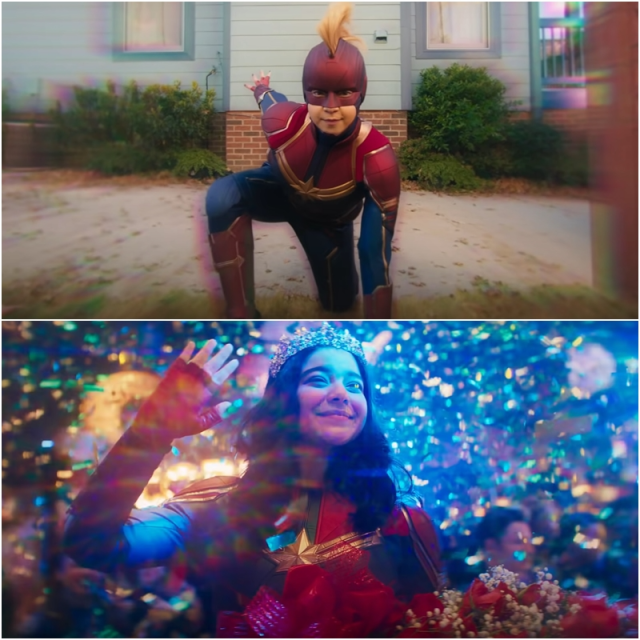 6. 驚奇隊長 卡瑪拉幻想自己穿上「驚奇隊長」的服裝,並且做出了「超級英雄落地」的姿勢。