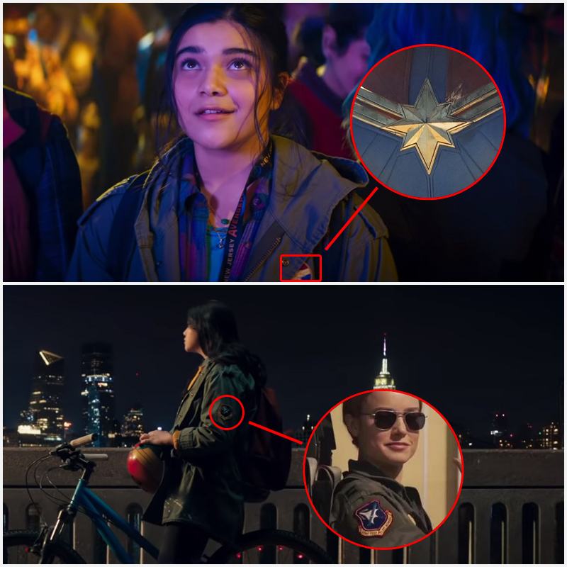 8. 驚奇隊長周邊 卡瑪拉的軍大衣上面裝飾了「驚奇隊長」的徽章以及卡蘿·丹佛斯以前服役時的空軍中隊布章,還去參加「復仇者聯盟博覽會」。 除此之外,卡瑪拉還有一頂「驚奇隊長」圖案的安全帽。