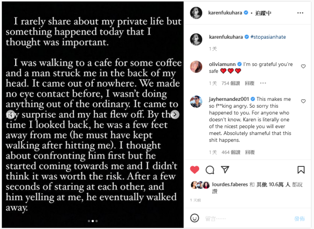 而她也提到自己相當幸運,該名男子並沒有攜帶武器,或是折回來繼續攻擊她。福原也承認,事件過後她有在考慮去學習防身術,「但為什麼我們這些『受害者』總必須要思考各種保護自己的方法?這些加害者到底能從攻擊女性、亞洲人,甚至是老人的行為裡獲得什麼樣的快感?他們必須為自己的行為負責,我們也應該好好想想,作為一個共同生活的群體,可以做些什麼來防止這些可怕的罪行繼續發生。」 圖/IG via karenfukuhara