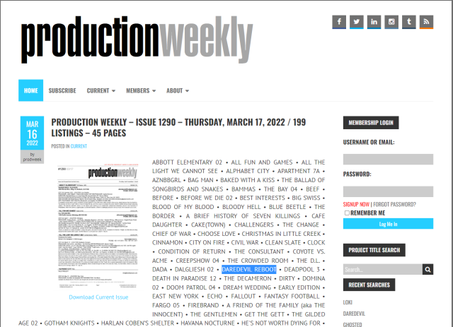 據報導,在最新一期的《Production Weekly》雜誌內容中,整理出了即將開發製作的電影、電視項目,當中除了已知的DCEU電影《藍甲蟲》(Blue Beetle)、「索尼漫威」《蜘蛛夫人》(Madame Web)、《獵人克拉文》(Kraven the Hunter),以及《死侍3》(Deadpool 3)外,上頭也寫著「DAREDEVIL REBOOT」,似乎意味著一度遭到腰斬的Netflix Marvel影集《夜魔俠》(Marvel's Daredevil)將有重啟可能。