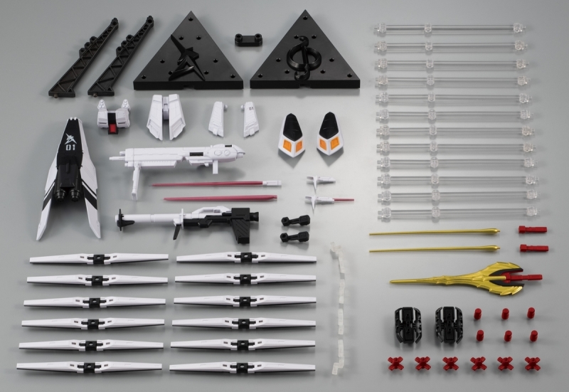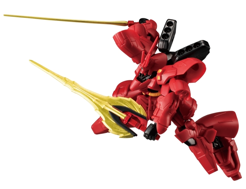 而沙薩比配件則包含 1 把光束戰斧、2 把光束軍刀,以及更加重現劇中機構的背部感應砲支架,相比一般販售版追加展開機構,能收納 6 枚感應砲(收納狀態)。另也附上 6 枚感應砲(展開狀態)搭配專用支架再現射擊場景。