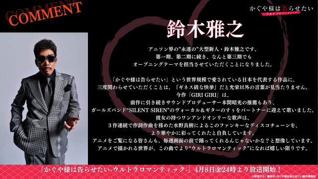 這次公開的片頭曲,將由前兩季演唱擔綱-號稱「動漫歌曲超大型新人」的鈴木雅之再次接下,並與日本女子樂團 SILENT SIREN 主唱吉田菫 ( すぅ ) 演唱歌曲「GIRI GIRI」,也希望這次的歌曲能讓喜歡這部動畫作品的朋友再次跳舞起來,享受劇情與音樂的感染力。