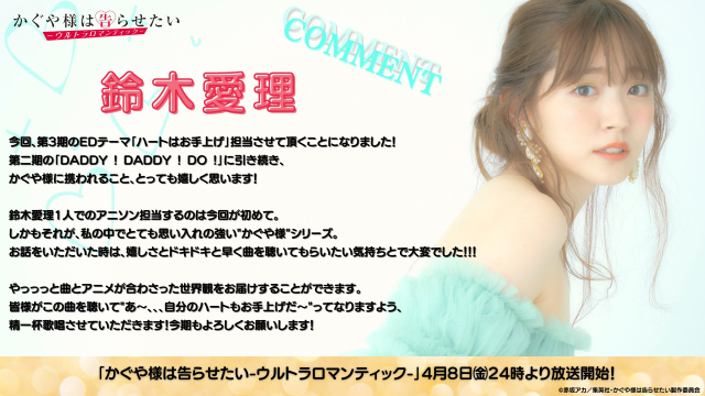 由漫畫家赤坂明(赤坂アカ)創作的作品《輝夜姬想讓人告白~天才們的戀愛頭腦戰~》 ,去年 10 月就公布將於 2022 年 4 月開播第三季動畫。今日 ( 3/18 ) 於官方所舉辦的『かぐや様』3期 World Premiere (ワールドプレミア) 中,正式公開第三季主題曲情報外,也釋出了正式預告影片。