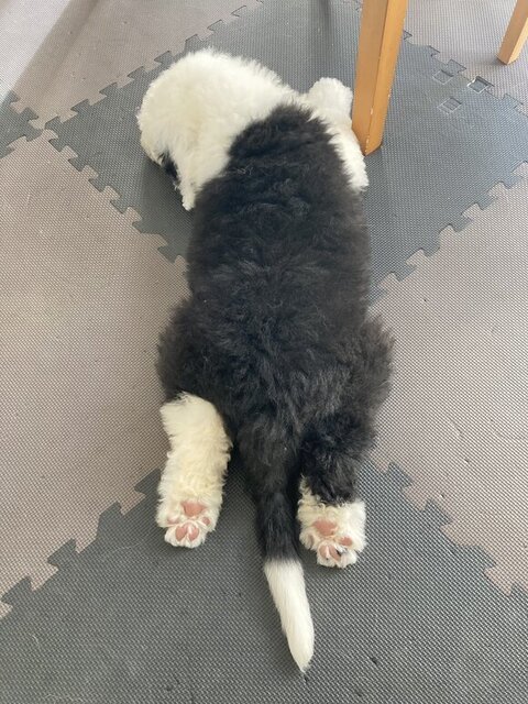 話又說回來,那所以這就是「白色品種」的米格魯嗎?開玩笑,當然不是啦!根據推主所說,這是在2022年1月時,剛來到家裡的一隻「英國古代牧羊犬」,並取名為「モプシー」。