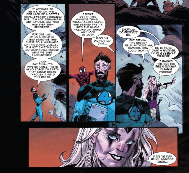 然而,幾周前在Donny Cates主筆的《索爾》連載第22期當中,索爾為了對付強大的敵人而向蓋婭祈求了力量,把自己和對手關在了能量壁中好保護其他人,而祂的養母弗蕾亞此時再次強調了蓋婭才是索爾生母的這項設定。