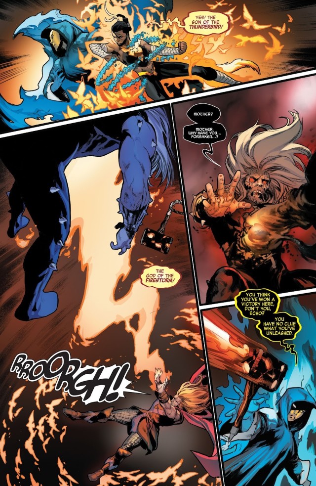 就在復仇者與各方勢力的選手打得不可開交時,留存在鳳凰之力當中的其中一位宿主,史前一百萬年時的變種人「火髮(Firehair)」居然現身在索爾的面前,並宣稱自己才是與奧丁生下索爾的人。