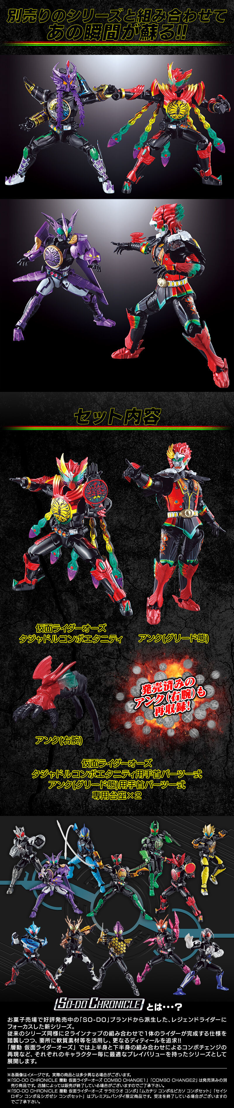 由日本萬代玩具公司食玩事業部 BANDAI CANDY 推出的假面騎士可動人偶食玩『SO-DO CHRONICLE』系列日前發表了出自完結篇《假面騎士OOO 10th 復活的核心硬幣》的最新商品「SO-DO CHRONICLE 層動 假面騎士OOO 復活的核心硬幣套組01」預計於 2022 年 09 月發售的消息。