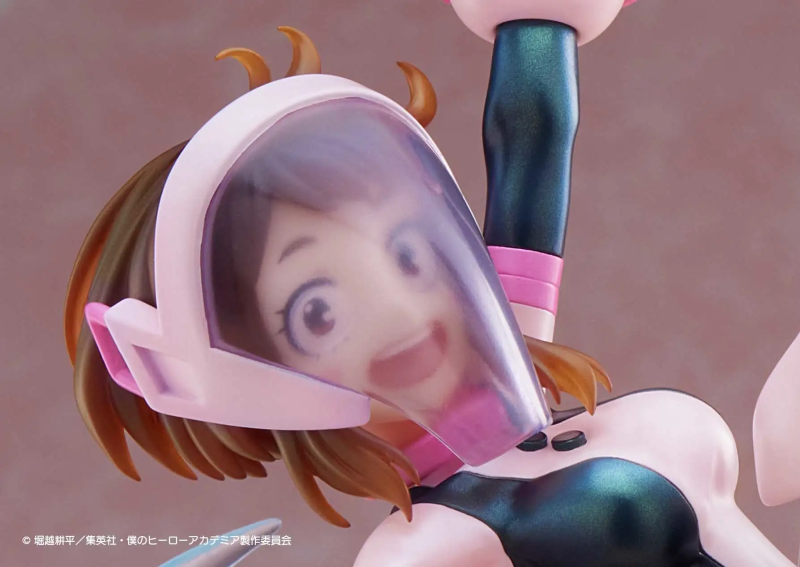 本作高約 28 公分,將「御茶子」的無重力個性與可愛的角色特質完美結合,身穿英雄服裝的御茶子展現出輕飄飄的姿態與開朗笑容,頭髮也形塑出在半空中飛揚的視覺效果,場景部分則是讓碎石、磚牆殘骸、粉紅色書包、電話......等藉著特效件營造出被御茶子的個性影響、變成無重力狀態的樣貌,此外,在 Spiritale 官方網站購買的話還可以獲得戴上頭盔造型的替換頭雕特典喔。
