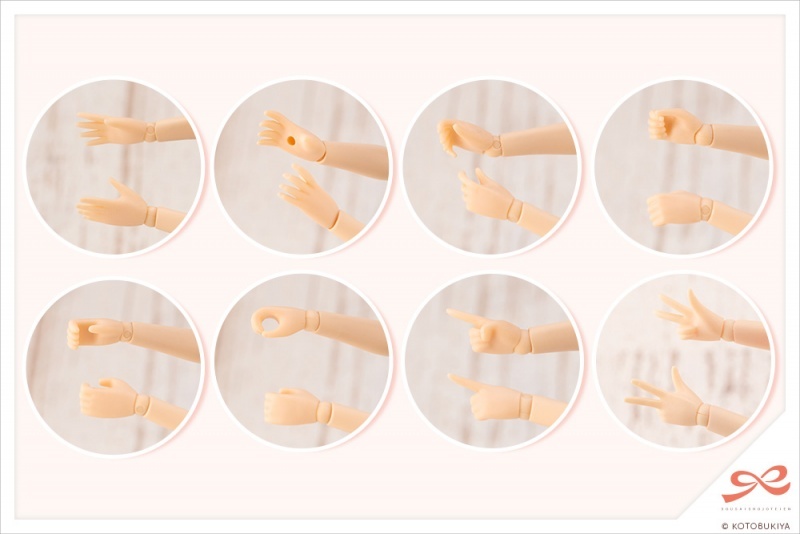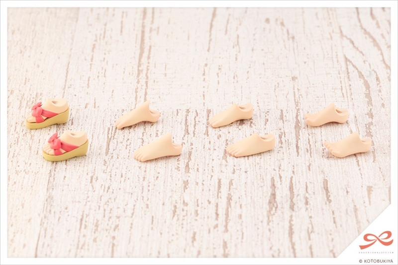 配件中共有「長直髮」「馬尾」「雙馬尾」三種髮型,「眨眼臉」「奸笑臉」「認真臉」「開口笑臉」四種表情,七種沿用造型手以及新規的「PEACE」造型手,還有「體育坐姿專用身體」、造型更加自然的「固定式手腕零件」、脫下涼鞋的三種造型「裸足零件」等豐富內容,更能將頭部替換成其他『創彩少女庭園』『骨裝機娘』『女神裝置』系列角色使用!