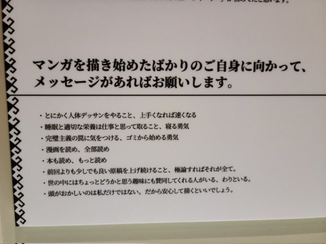 推特網友「ゆーくりっど」貼出了展覽角落的照片,原來這裡寫的是一個短短的問答:「請對剛開始畫漫畫的自己說一些話吧」。