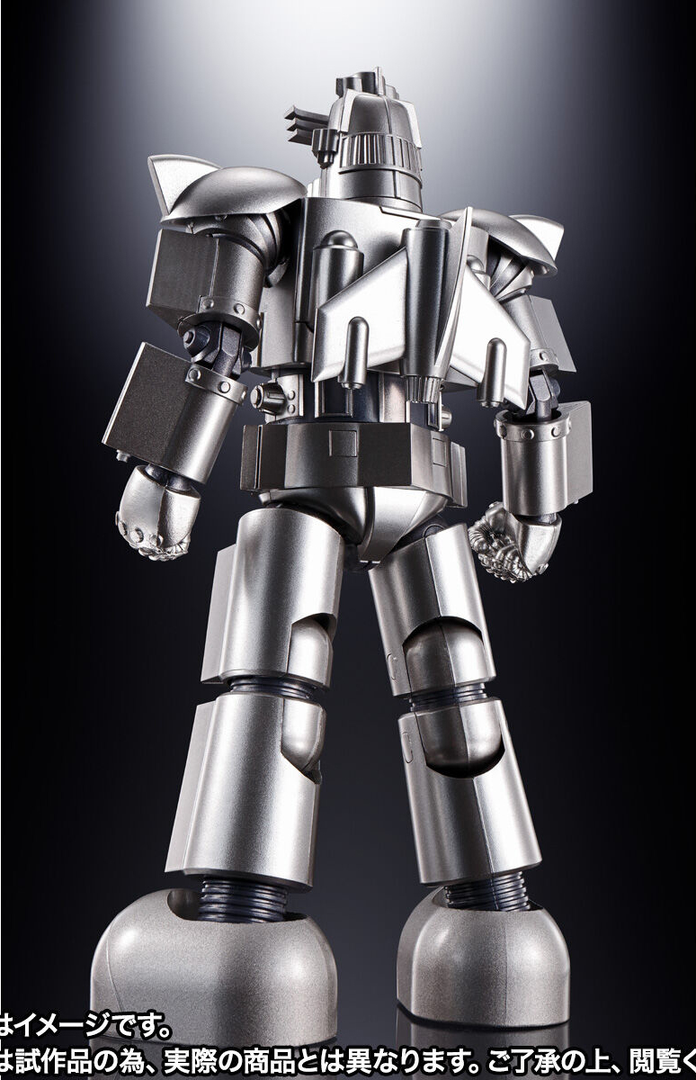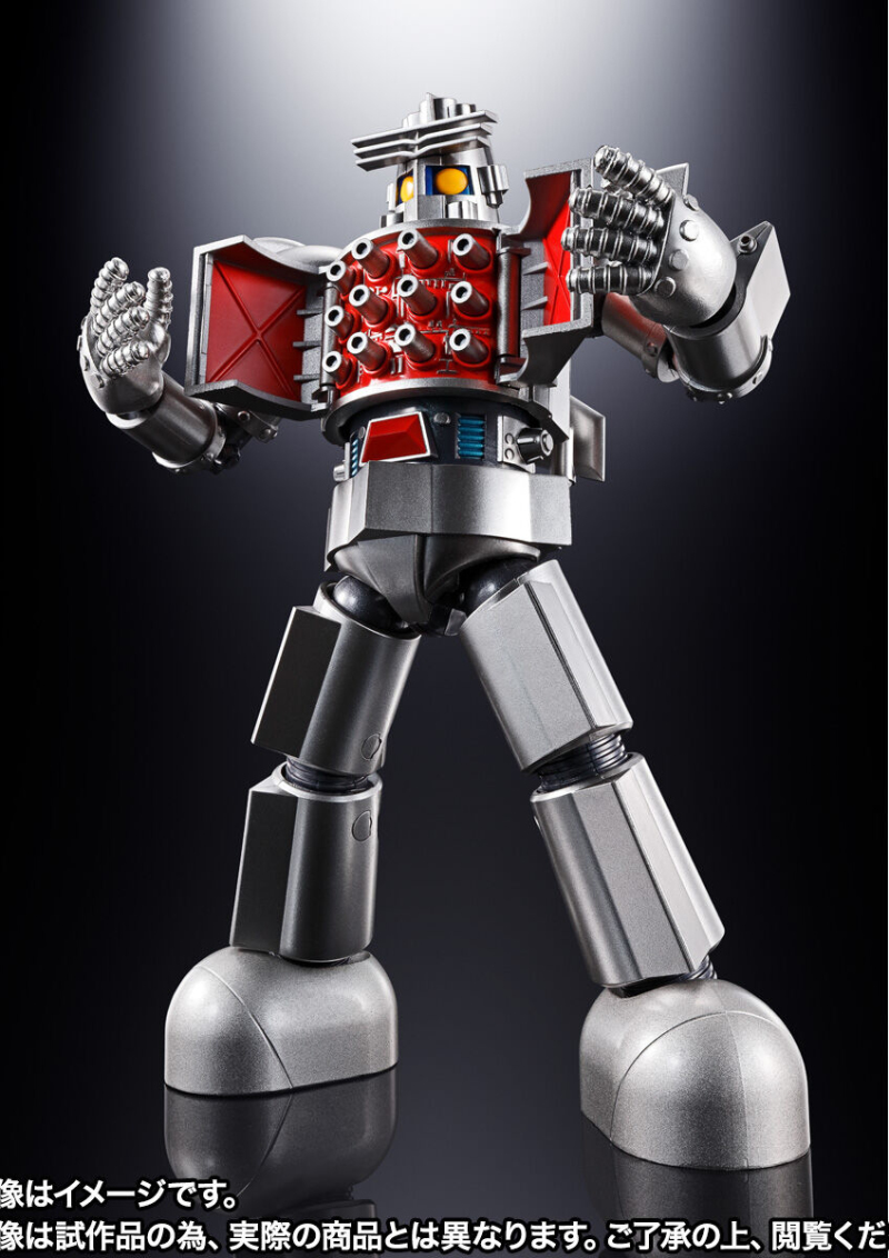 「超合金魂 GX-101X 大鐵人18」全高約 18 公分,部分零件採用合金材質製作,並施以極具金屬質感的銀白塗裝,再現厚重感十足的復古設計。手肘、髖部採用拉出式關節擴大可動範圍,更能展開胸口內藏的多連裝飛彈發射器!