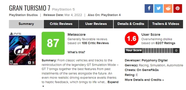 眾所周知,《GT7》發售後因為一連串神奇的應對、以及幾乎把玩家當羊宰的內購功能,使得玩家罵聲連連、評價直接雪崩。目前在Metacritic 上的玩家評分已經崩到了1.6分的新低,和《巧可啵GP大賽車》不相上下,幾乎可說是一場誰最可啵的比拚大賽。