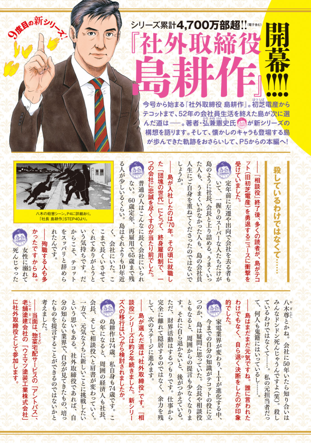 日本漫畫家弘兼憲史所創作的漫畫系列作品《島耕作》,先前 2 月時《顧問島耕作》邁入完結。在今日 ( 3/24 ) 發行的講談社雜誌《Morning》正式公開新作《非執行董事島耕作》連載,作者弘兼憲史也談及了新系列的概念。