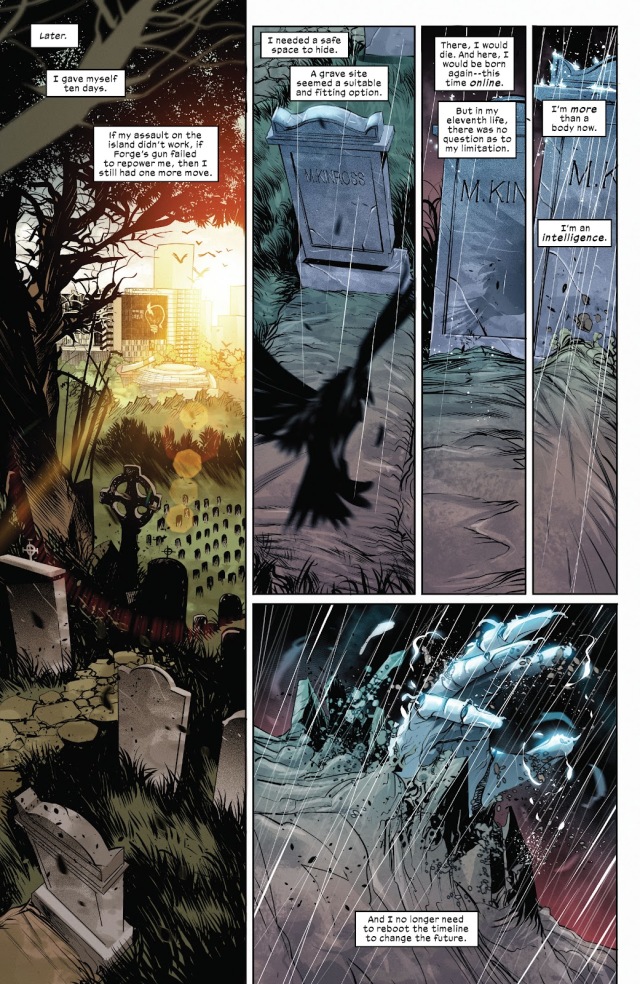 金鋼狼總算可以與家人朋友一起休息了。但是,先前偷偷透過人類科學家Arnab Chakladar的協助將自己的意識偷偷灌入一具機械身軀的莫伊拉卻從墳墓裡爬了出來。原來她早就設計好要在本體沒能完成任務的情況下在十天後啟動!
