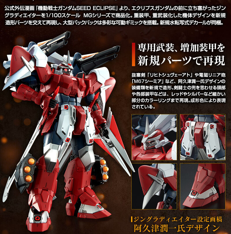 由日本 BANDAI SPIRITS 公司 HOBBY 事業部發行,搭配著最新技術、分件完整且高度可動的鋼普拉『MG(Master Grade)』系列今日宣佈出自《機動戰士鋼彈SEED ECLIPSE》的新機體「MG 1/100 劍鬥士型基恩(暫譯)」預計於 2022 年 07 月發售的消息,此商品僅在萬代官方網路商店 PREMIUM BANDAI 限定販售。