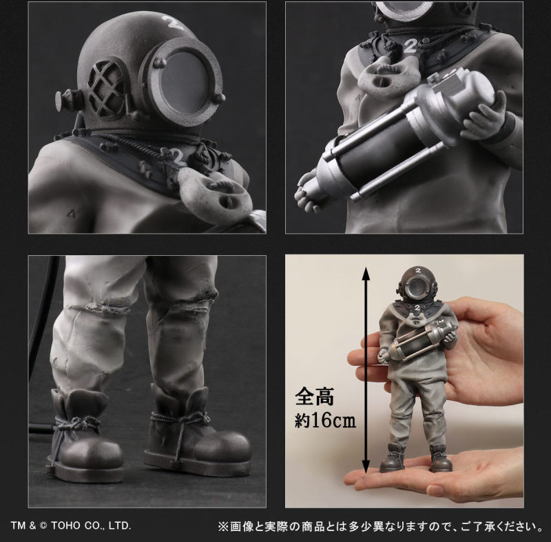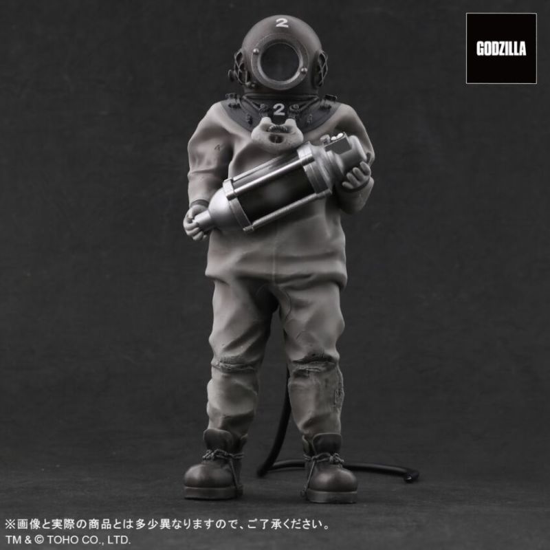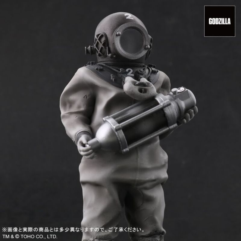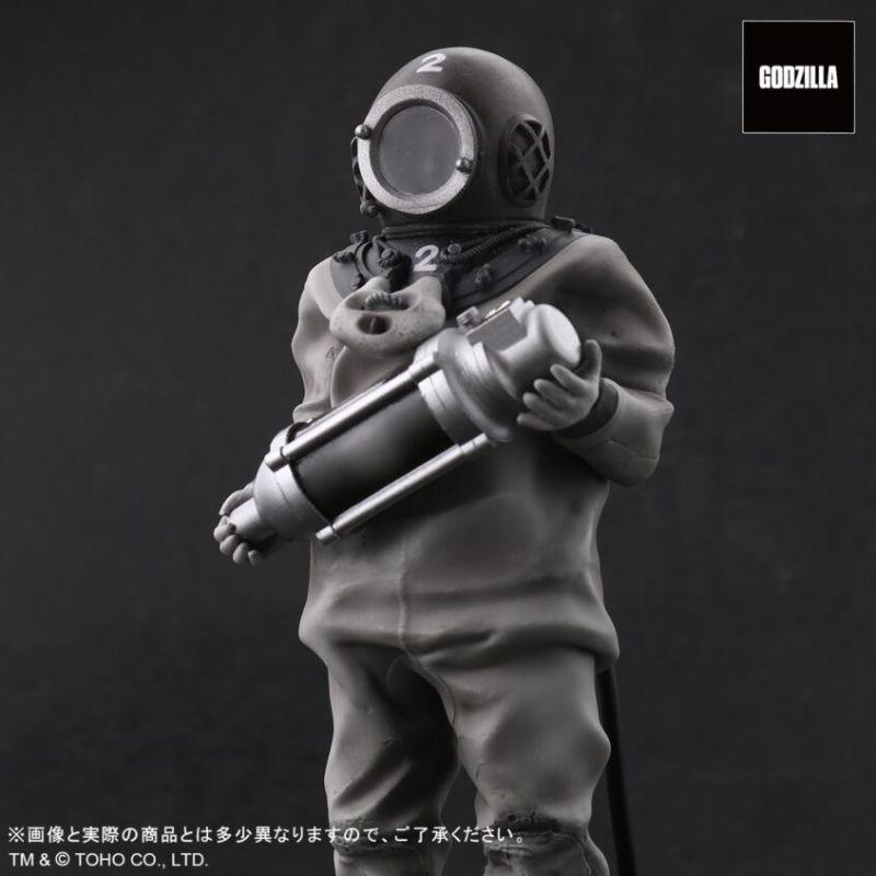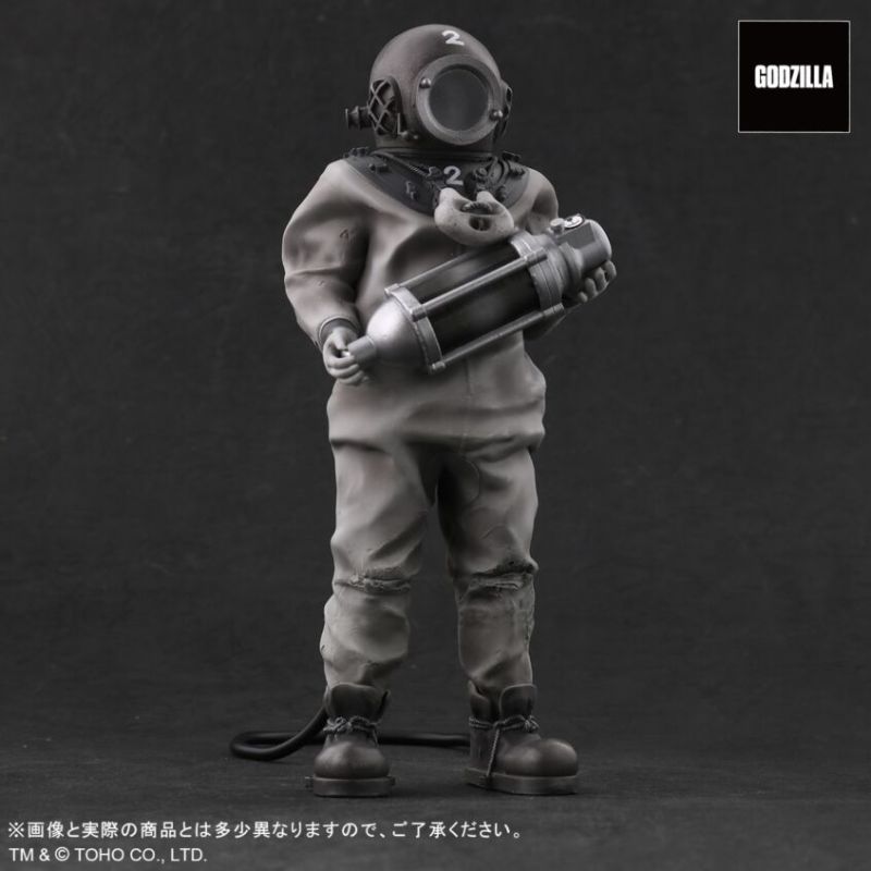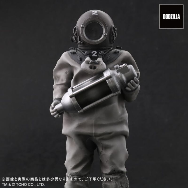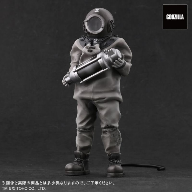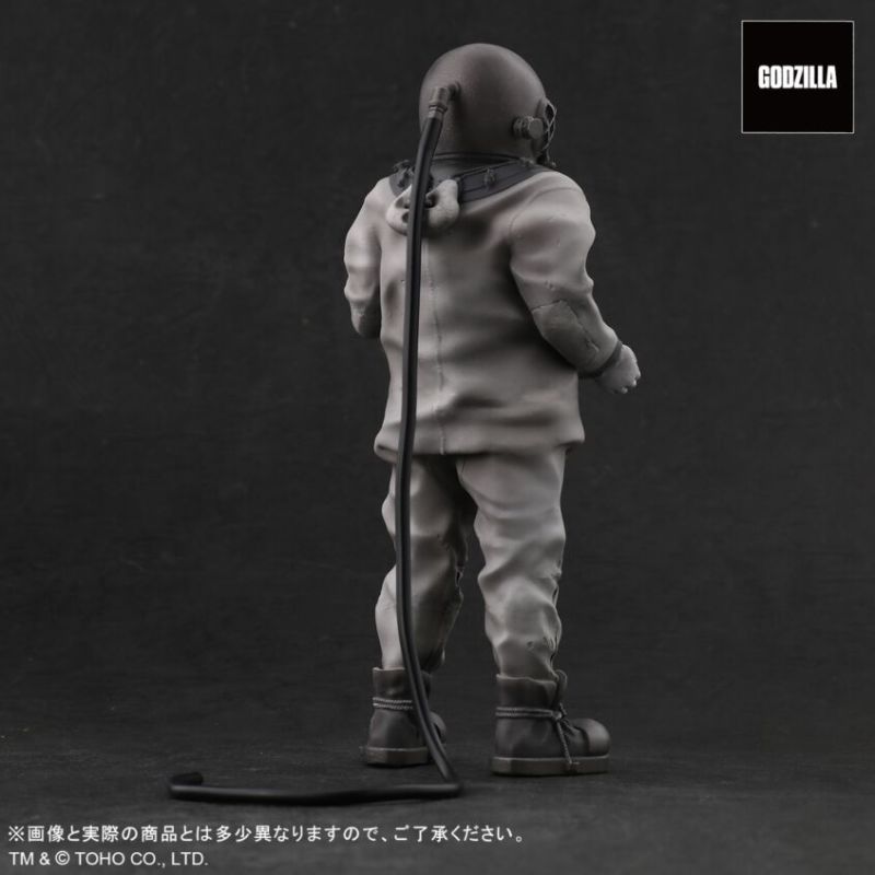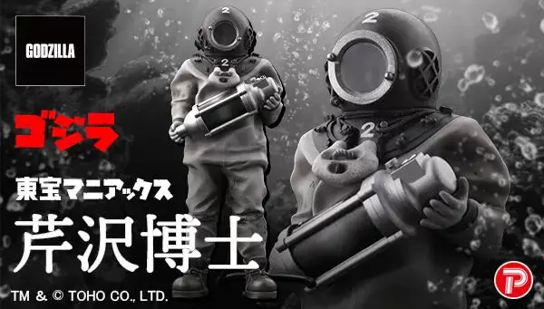 「東寶 Maniacs 芹澤博士」PVC塗裝完成品,尺寸全高約 16 公分,還原身穿潛水服的芹澤博士,手中抱著毀滅性的「水中氧氣破壞裝置」,雖然看不清楚臉上的神情,卻能感受到博士將壯烈犧牲的覺悟及堅毅。塗裝採用重現黑白電影的黑灰色風格上色,但在潛水服、頭盔以及金屬配件等細節皆有精彩的表現。