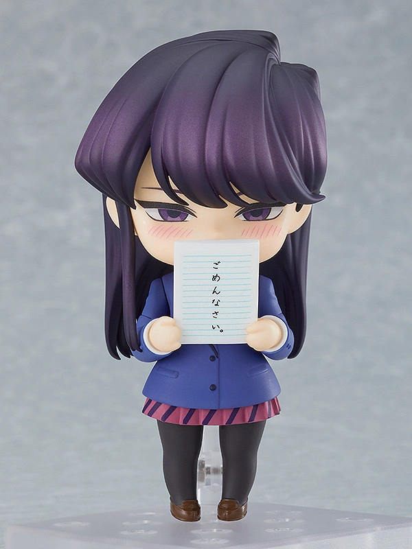 以黏土人 Q 版比例重新詮釋的「古見硝子」高約 10 公分,再現了她身穿私立伊旦高中制服的招牌造型,並仔細地描繪出讓人著迷的美貌與長髮,條紋蝴蝶結、短裙超可愛!可以呈現出美麗的「普通臉」、使人心動的「害羞臉」,與豆豆眼狀態的「鼻氣臉(フンス顔)」三種表情,配件包含書包、寫有「謝謝」與「對不起」日文的筆記本,以及能裝在頭頂的貓耳造型頭髮零件,搭配多個替換手,就能重現古見同學的豐富姿態喔!