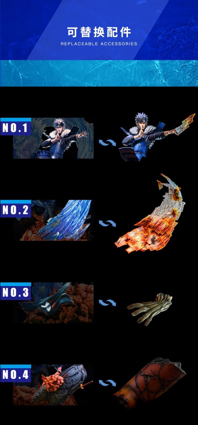 另外「二代目火影 千手扉間-典藏版」1/4比例全身雕像,追加有「水遁·水龍彈之術」的替換零件,再現令人印象深刻的恐怖的水龍。尺寸高達 73 公分,透明材質打造的水龍由腳下而起,霸氣環繞於身,在內置的光效下更顯層次與色澤變化。附有轉生之前的臉部頭雕,還原冷酷的形象。