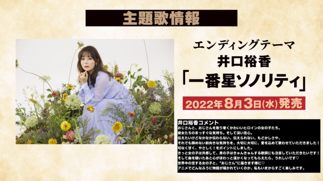 主題曲部分,片頭 OP 宣布由歌手前島麻由演唱歌曲「Story」,先前他也負責過電視動畫《Re:從零開始的異世界生活》下半片頭曲「Long Shot」過;而片尾 ED 則由聲優井口裕香演唱歌曲「一番星ソノリティ」。