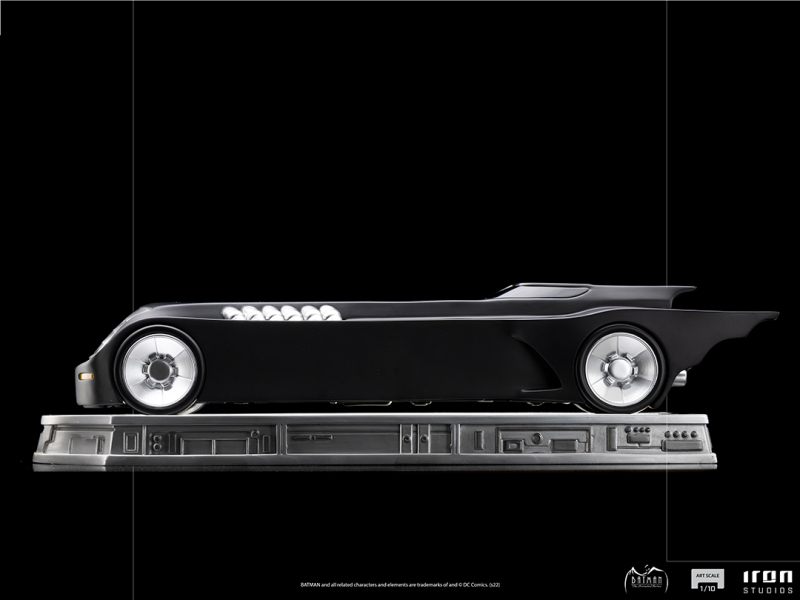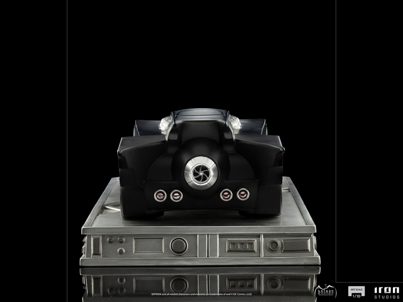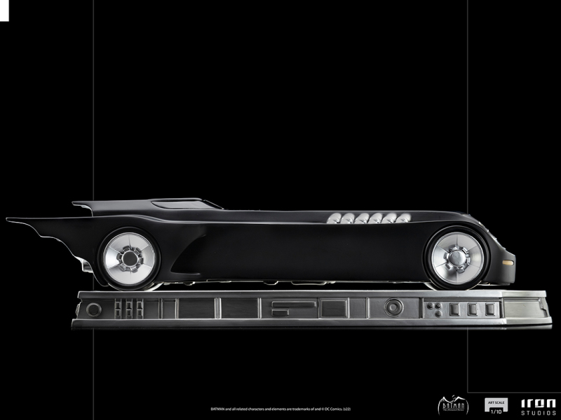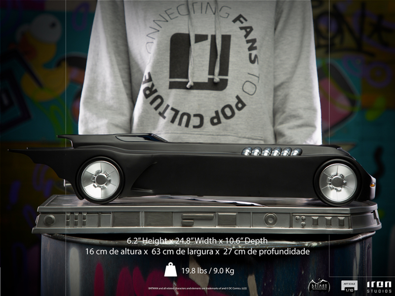 這次的新作是在 Iron Studios 旗下的「Art Scale」系列推出,蝙蝠俠高約 24 公分,蝙蝠車則擁有極具存在感的 63 公分長,兩者皆依據《蝙蝠俠:動畫系列》的設定充分展現經典造型,蝙蝠俠本體形塑出誇張的肌肉線條,增添立體感的陰影塗裝與披風的飛舞動感也十分出色,蝙蝠車則再現了超長的車身與洗練、搶眼的設計,底座部分是以相同的風格製作,蝙蝠俠雕像還有《蝙蝠俠:動畫系列》LOGO 的名牌!