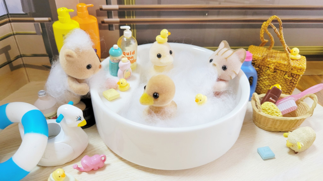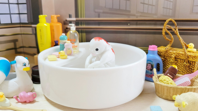 有名推主ねこすけ丸(@nekosukemaru110)在大創買了售價100日元的陶瓷湯勺座,但他不是拿來放湯匙勺子,而是給「森林家族」的朋友們當浴缸用,以棉花充當泡泡放在湯勺座哩,然後再讓玩偶們泡進裡面,這樣就宛如他們在浴缸泡澡一樣,畫面突然變得非常可愛,周圍再放一些玩水的道具,感覺好快樂的樣子。