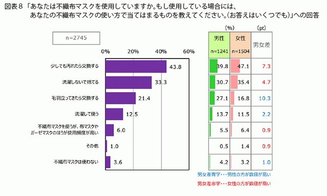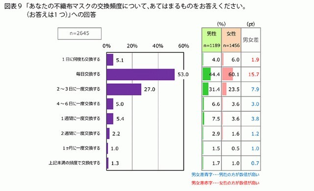 此外,日本媒體還發現「男性似乎有同一片口罩用比較久的傾向」。的確,女性有60.1%選擇了「每天換口罩」,男性卻只有44%。