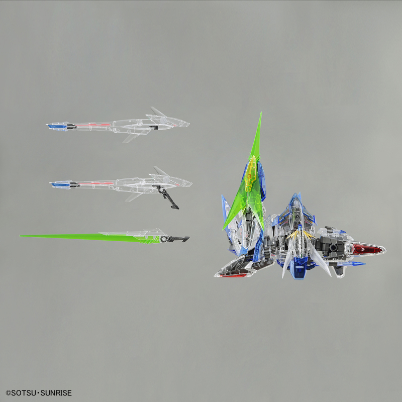 「MG 1/100 星蝕鋼彈[透明配色]」套件以 2021 年推出的一般版套件製作,沿用部分自由鋼彈 2.0 的骨架,再現細節豐富且銳利精悍的外裝甲,以及不需替換零件就能完成的 MA 變形機構。兩把光束軍刀、雙臂光束盾皆附有透明綠光束零件,可再現帥氣的戰鬥場景。