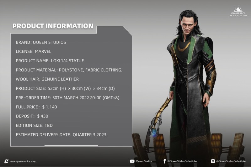 擅長以大比例雕像表現角色魅力、重現逼真細節的造型廠牌 Queen Studios 於昨(29)日發表了出自 MARVEL《復仇者聯盟》的最新作「洛基」(Loki)1/4 比例全身雕像!預計 2023 年第三季發貨。
