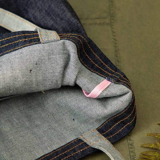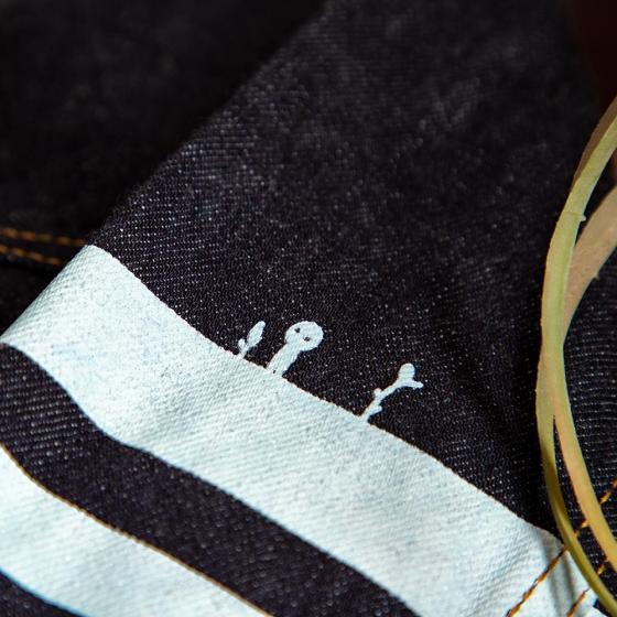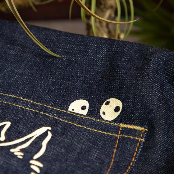 以重磅原色丹寧布料製成,在 Momotaro Jeans 著名的兩橫條圖樣上配有著木靈圖案,且還具有蓄光的功能,在黑夜中能夠發出光芒。兩側口袋的襯布也使用《魔法公主》中出現的各種生物作為圖案裝飾,雖然低調但露出時別有韻味。