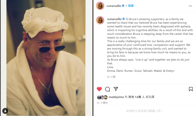 老布的家屬在共同聲明中表示:「致布魯斯的支持者們。身為家人的我們,想分享我們摯愛的布魯斯一直在經歷一些健康問題,他最近被診斷出患有失語症,這已經影響了他的認知能力,因此在經過深思熟慮之後,布魯斯將放下對他來說意義重大的演藝事業。