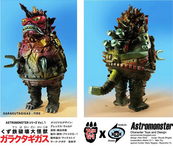 玩具新聞 軟膠 怪獸 Garakutagigas鋼鐵破壞大怪獸 熊倒 2011-08-28 20:10:49 分享 ✕ 分享 已複製網址 分享到 Facebook 分享到 LINE 分享到 Reddit 分享到 Twitter 分享到 Plurk 分享到微博 Garakutagigas鋼鐵破壞大怪獸 設計:Alex Wald 原型:奧田茂喜 熊倒 玩具熱愛者與情色蒙面藝術家的Rockin'Jelly Bean的信徒。對12吋、吊卡玩具以及復古造型有莫名的狂熱。