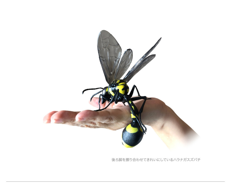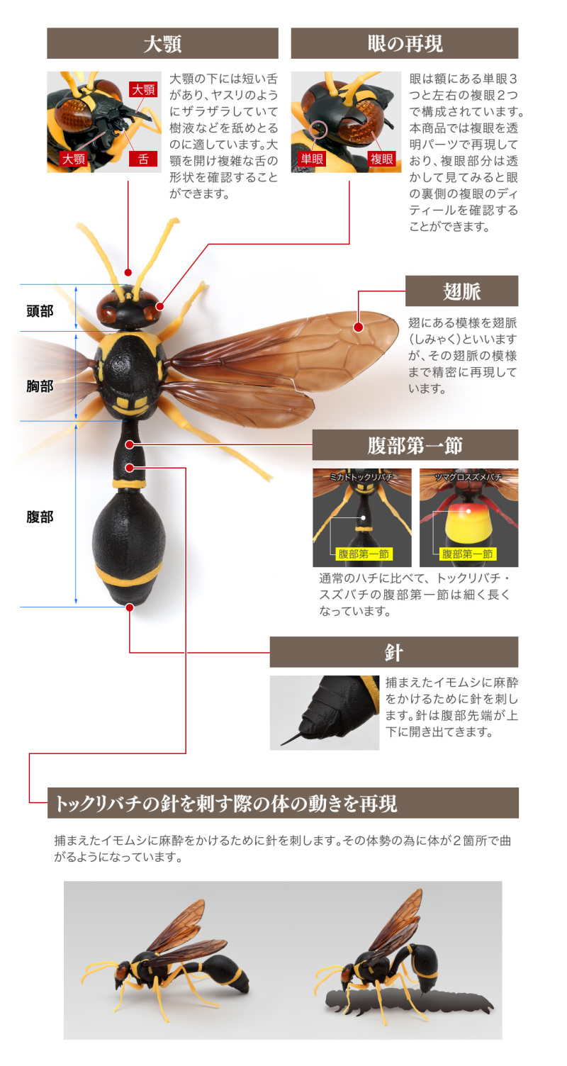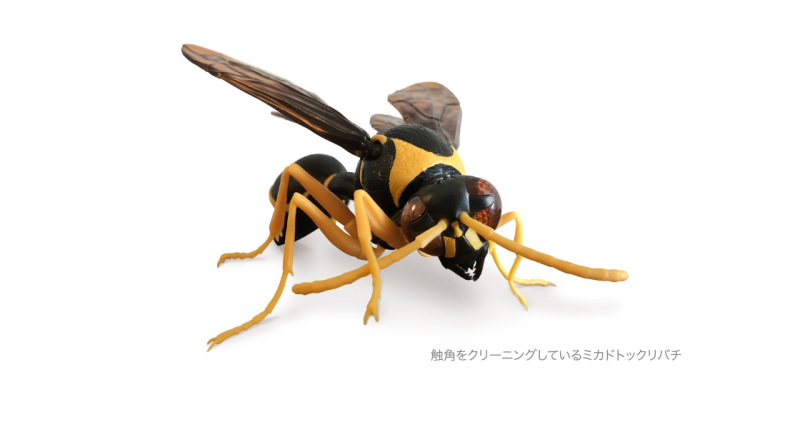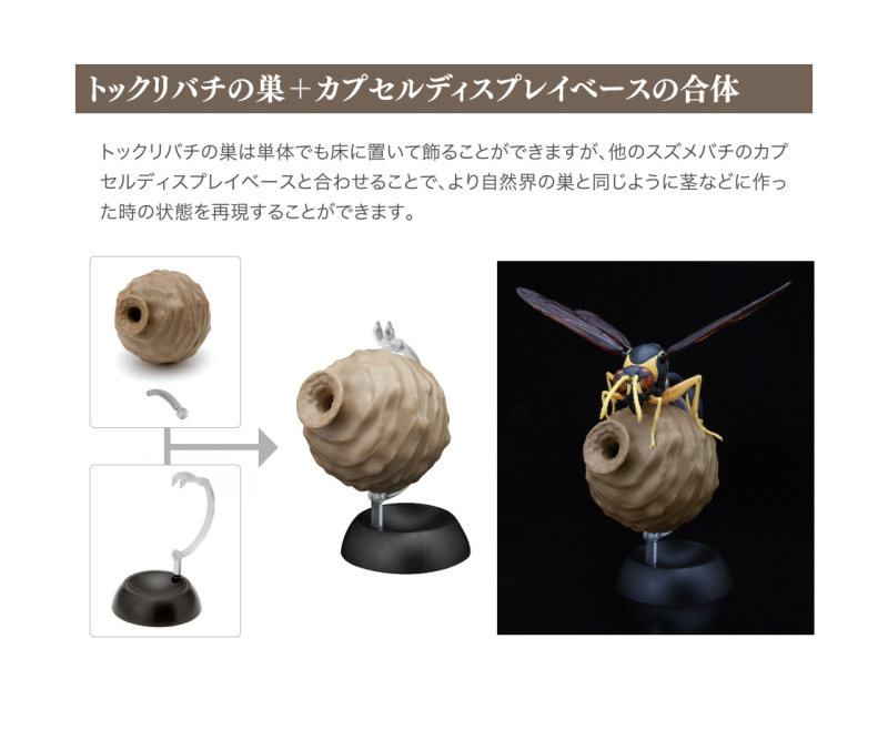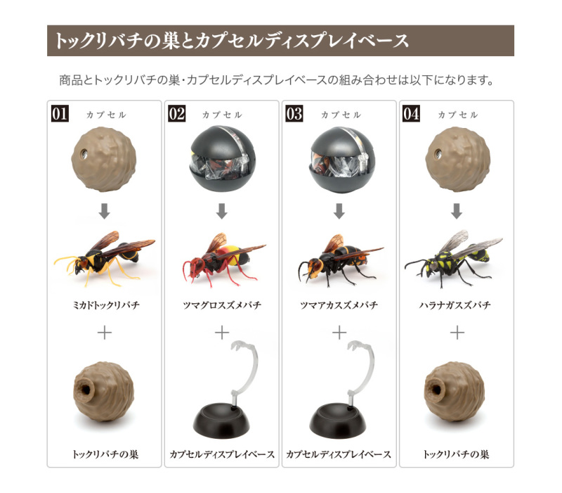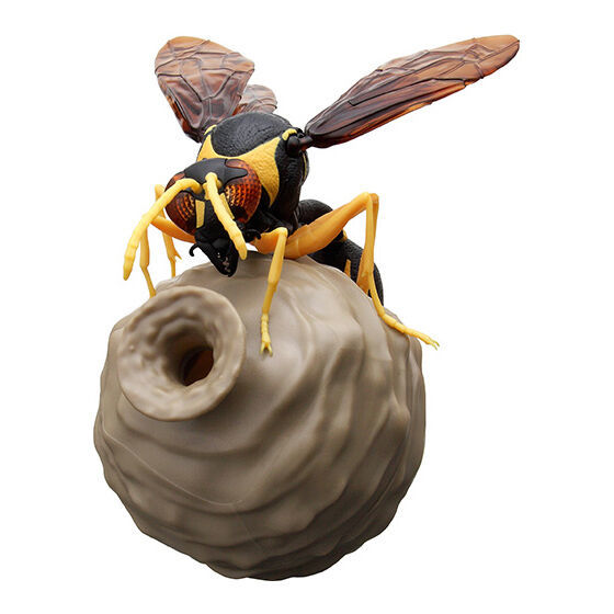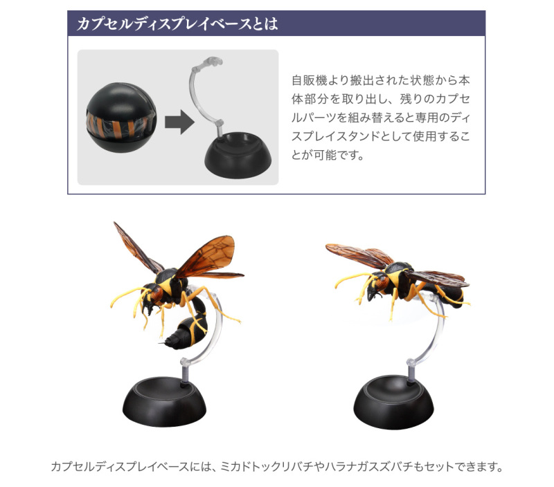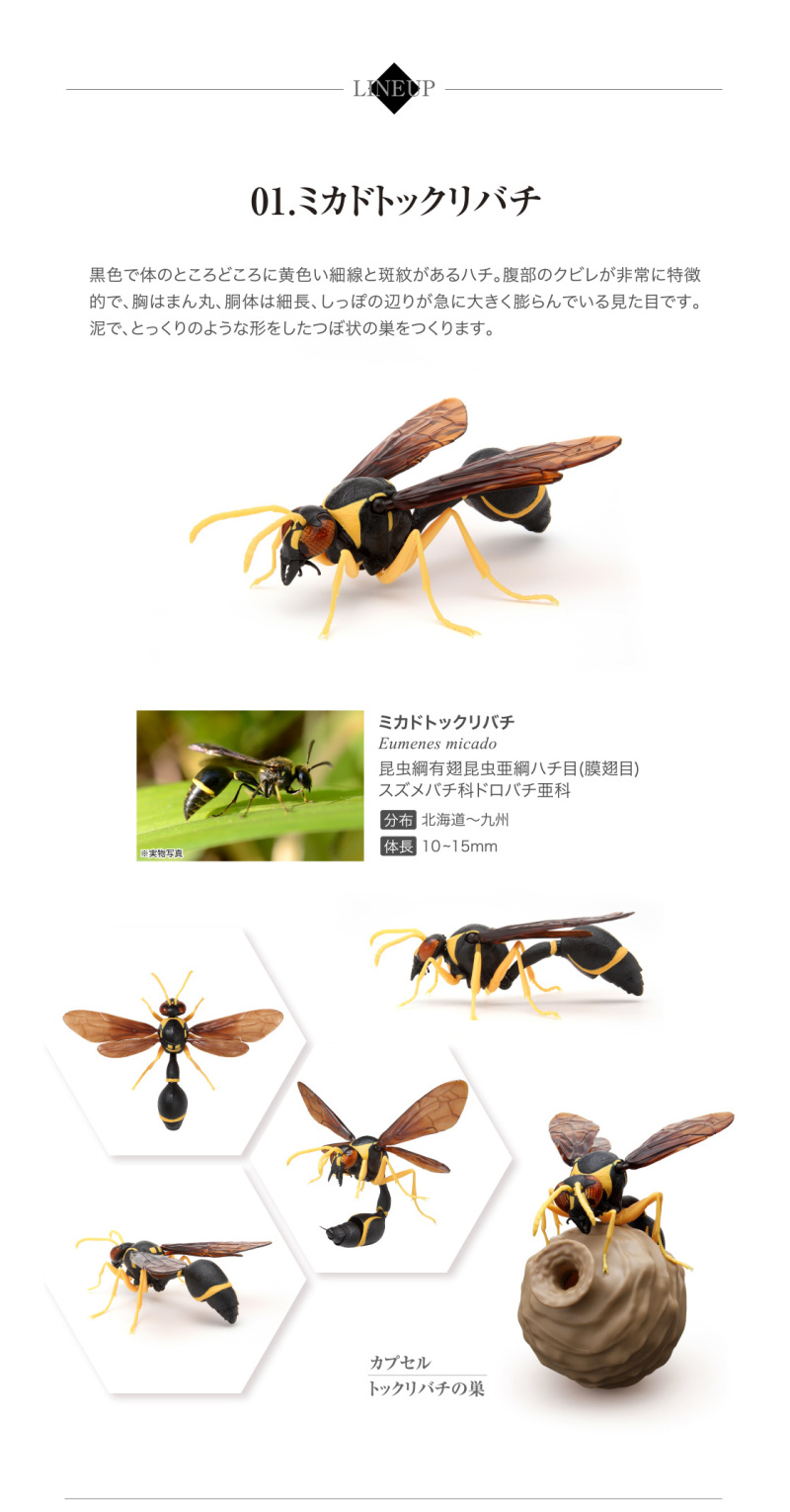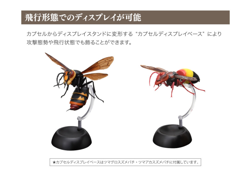 「GASHAPON 生物圖鑑 德利蜂」轉蛋,採用 X 光線 CT 掃描徹底還原標本的造型!包含軀體上的表面細節以及腳的肢節等,透過 33 個零件組成,以具有威脅性的 15 公分大尺寸打造,陣容分別有:帝德立蜂、黃腰虎頭蜂、黃腳虎頭蜂以及虎斑泥壺蜂,逼真將身體結構真實再現,透過 18 個可動關節與內部活動機構設計,完整重現包含大顎、觸角與尾部可重複使用的螫針出針機制!透明材質的翅膀細節,展翅時更是達 20 公分寬。另外,也重現築泥巢的特性,將轉蛋殼設計為泥壺的造型,組裝後可以還原特色的蜂巢!