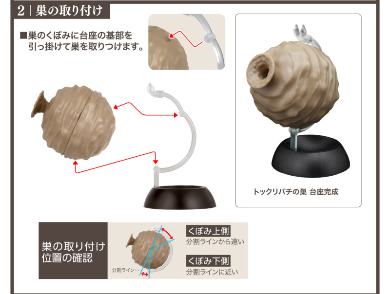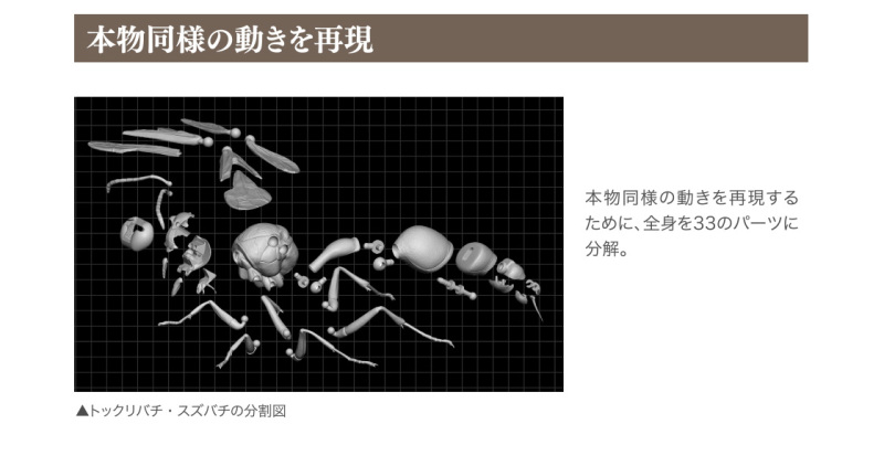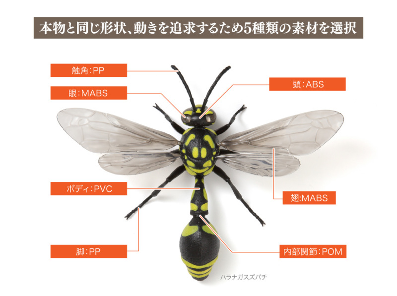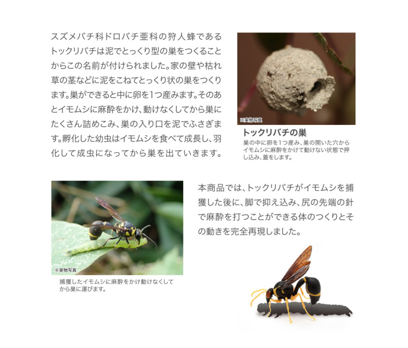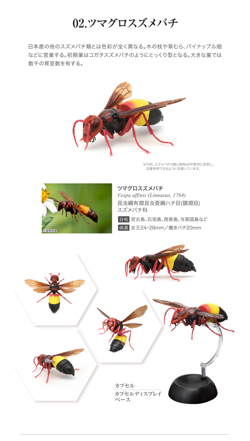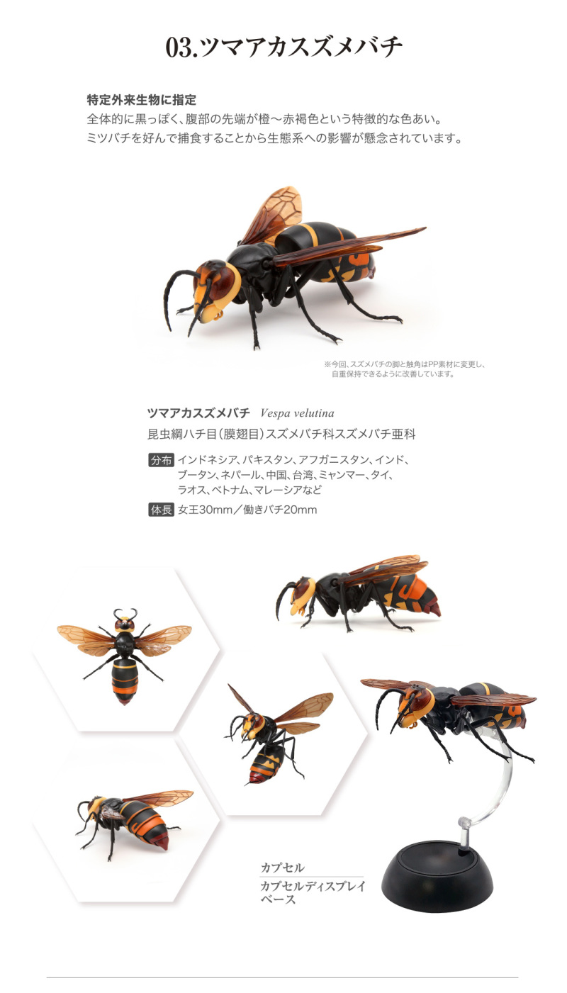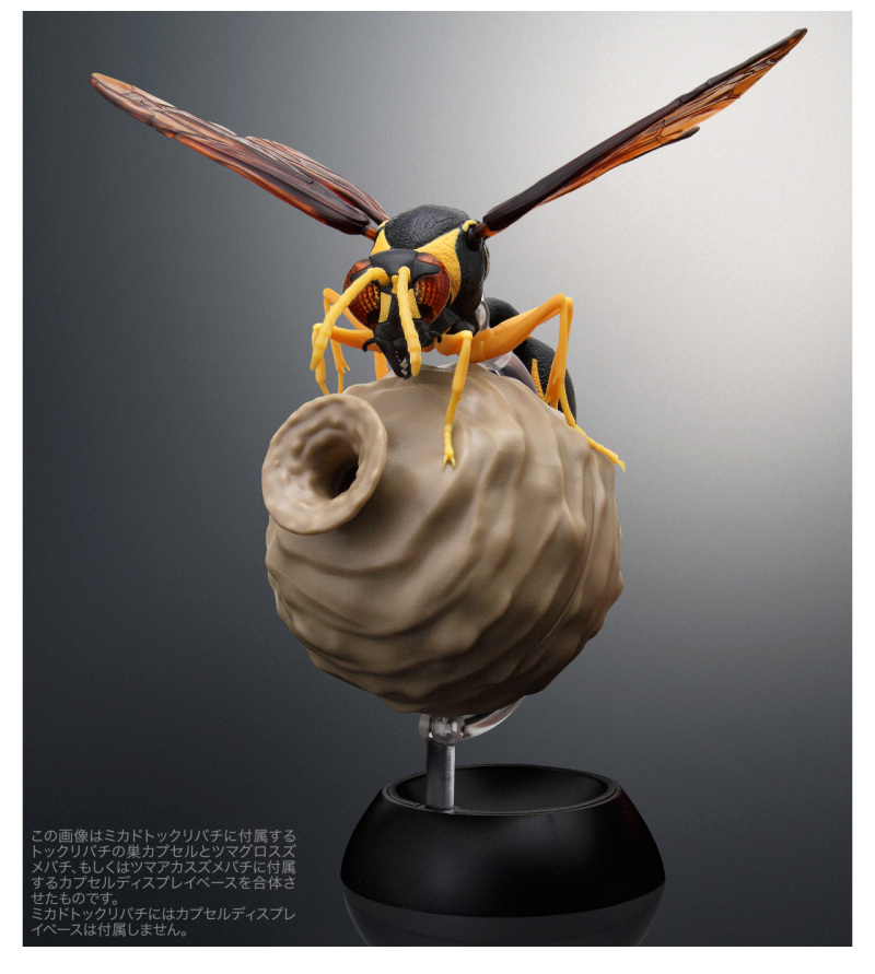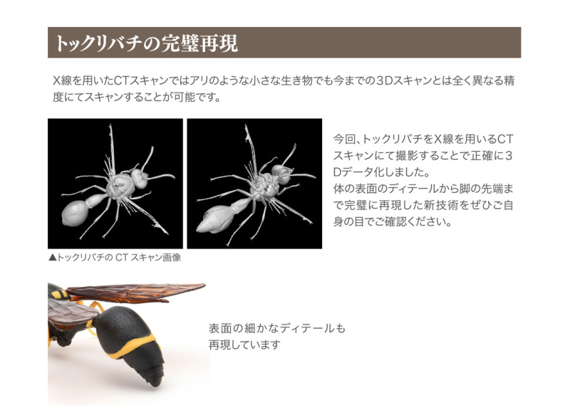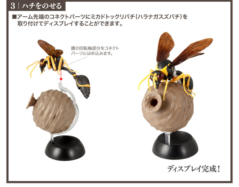 「GASHAPON 生物圖鑑 德利蜂」轉蛋,採用 X 光線 CT 掃描徹底還原標本的造型!包含軀體上的表面細節以及腳的肢節等,透過 33 個零件組成,以具有威脅性的 15 公分大尺寸打造,陣容分別有:帝德立蜂、黃腰虎頭蜂、黃腳虎頭蜂以及虎斑泥壺蜂,逼真將身體結構真實再現,透過 18 個可動關節與內部活動機構設計,完整重現包含大顎、觸角與尾部可重複使用的螫針出針機制!透明材質的翅膀細節,展翅時更是達 20 公分寬。另外,也重現築泥巢的特性,將轉蛋殼設計為泥壺的造型,組裝後可以還原特色的蜂巢!