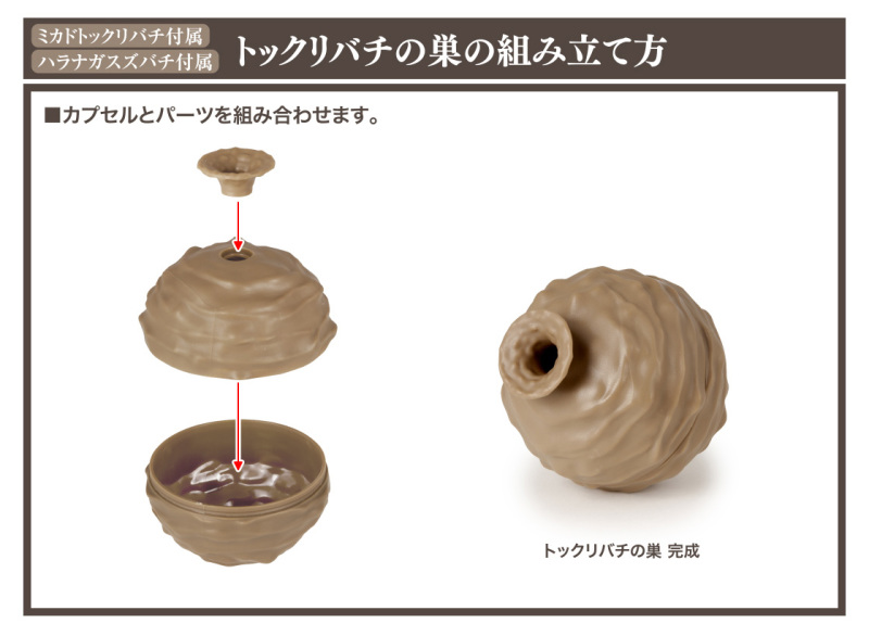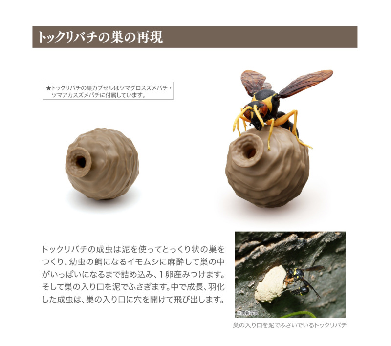 日本萬代玩具公司轉蛋事業部 GASHAPON 旗下高人氣的超擬真無殼環保轉蛋,在推出生物圖鑑系列「虎頭蜂」、「大虎頭蜂02」等精彩作品後,又將推出新系列的「德利蜂(とっくりばち)」轉蛋,共有四種款式,每轉參考售價為 500 日圓,預計將於 2022 年 04 月第四週危險登場!