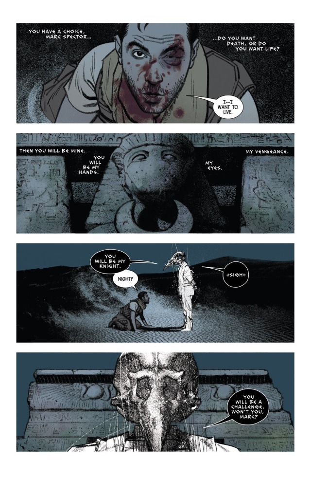 月神孔蘇答應讓他復活,但交換條件是他必須為他效力,於是他便擁有了「月光騎士」的身分與超能力。