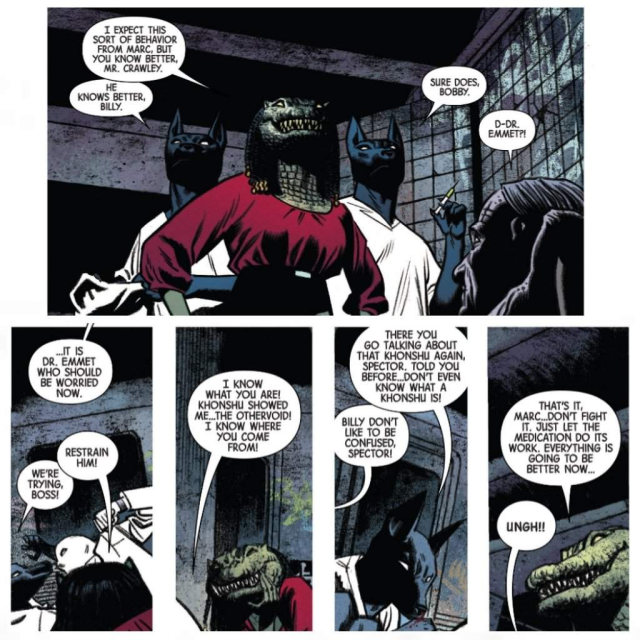 本集最終,史蒂芬在博物館被一種狼犬型態的怪獸追殺,危急時刻將身體交由馬克控制,並成功化身為「月光騎士」爆揍狼犬。這個狼犬很可能就是阿米特的手下,在2016年《月光騎士》漫畫中,阿米特的手下就是狼犬的頭型。