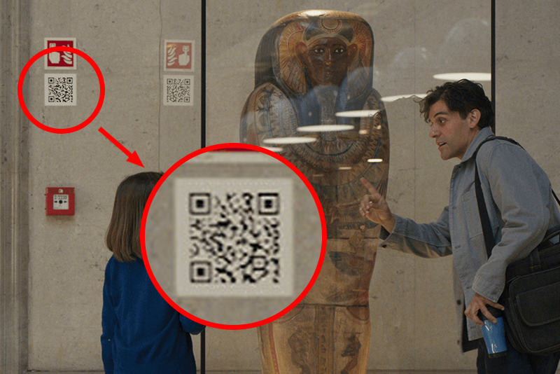 史蒂芬來到博物館的時候,和一個逛展的小女生賣弄自己對埃及神話的了解。這時當你用手機掃描牆上的 QR Code 會進到漫威的官方網站,並且可以限時免費閱讀月光騎士首次登場的《Werewolf by Night》漫畫! 附圖幫大家找了解析度較高的劇照,大家可以試試看~