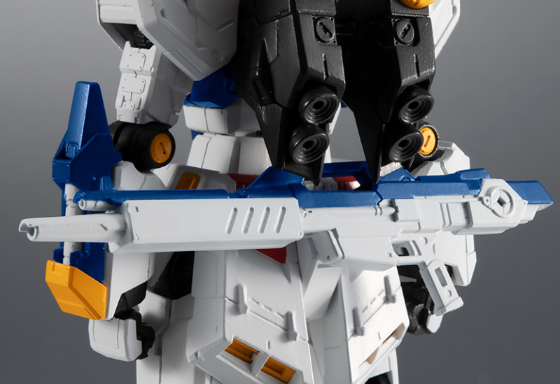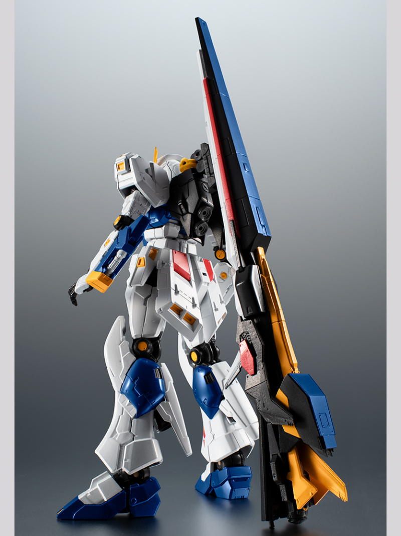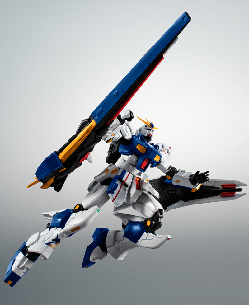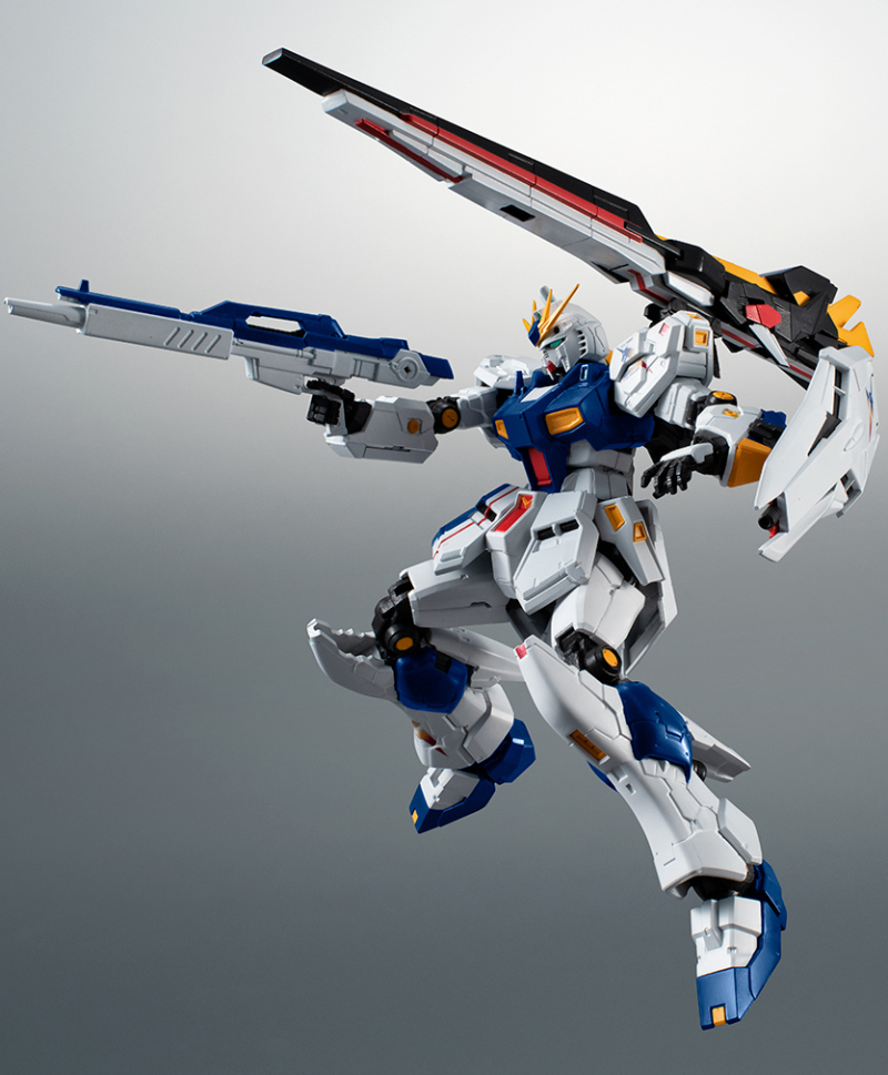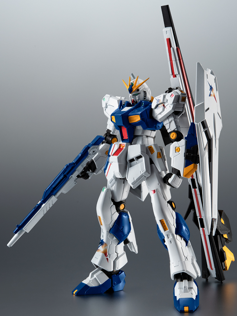 「ROBOT魂 RX-93ff ν鋼彈」以造型精密、可動設計靈活的上色完成品規格再現福岡實物大 ν 鋼彈立像,具備豐富的裝甲刻線與細節造型,以及尺寸比本體更長的新武裝「長程翼狀感應砲」。包含全身機身標誌、黃色散熱口等皆已上色完成。