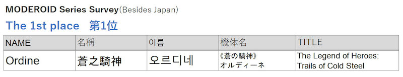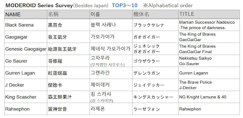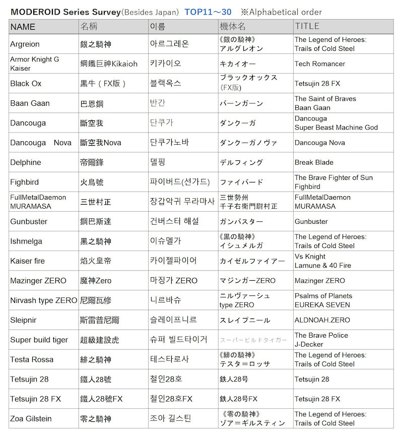接下來是日本國外的問卷調查結果,調查對象來自北美、歐洲、亞洲等多個國家,除了前次就上榜的勇者王等勇者系列、紅蓮螺巖、斷空我等海外知名度較高的機體外,前幾名的結果也和日本國內相同受到確定商品化的同作品機體影響,其中對於《英雄傳說:閃之軌跡》騎神系列機的期待度意外地高。