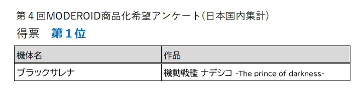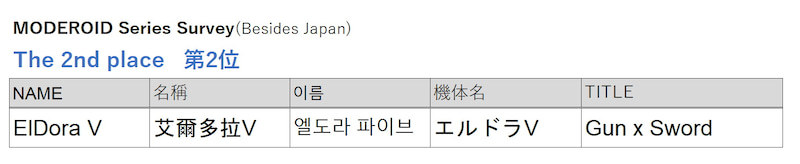 首先看到日本國內的問卷調查結果,從「黑白合」「蒼之騎神」到「艾爾多拉V」「Big-Duo」等機體,都受到先前『微笑衝擊』發表會中確定商品化的同作品機體影響,不僅是最有機會延續話題而決定商品化的機體,也反映出前幾次問卷以來 MODEROID 玩家的偏好。