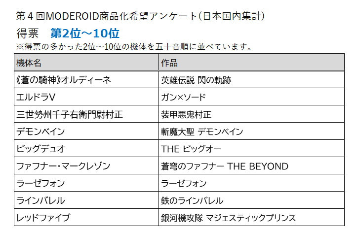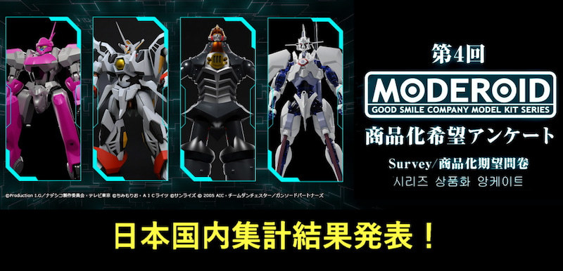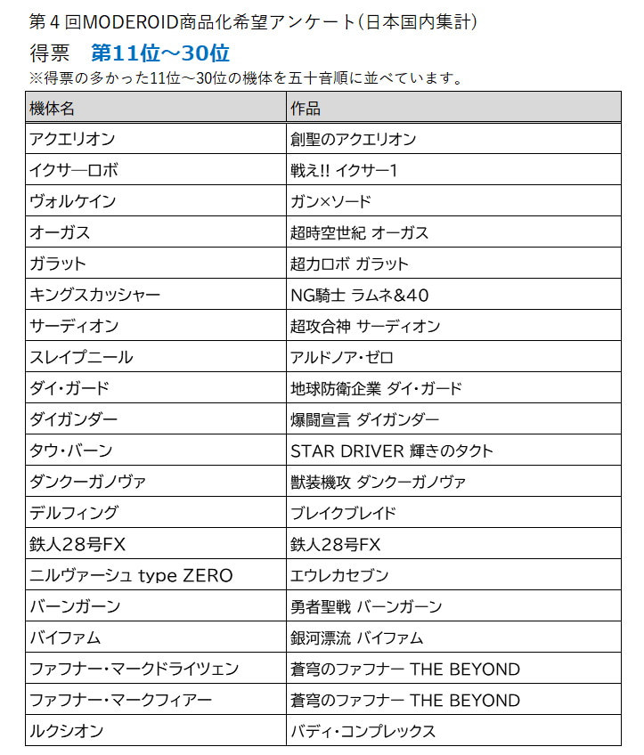 由日本 MECHA SMILE 品牌所推出的機械主題組裝模型『MODEROID』系列於 2022 年 01 月 17 日~ 02 月 09 日在日本國內外舉行的「第4回商品化希望問卷調查」,終於在日前公佈最終結果,一口氣發表海內外玩家們最期待的 1~30 名機體!