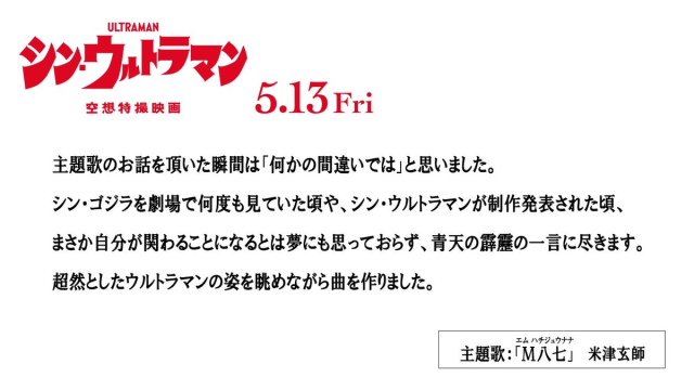 由圓谷製作、東寶和 Khara 聯合製作,貴為庵野秀明企劃「新·日本英雄宇宙」的第三部作品-特攝英雄怪獸電影《新·超人力霸王》。已經離上映時間約一個月的時間。官方今日 ( 4/8 ) 再度公布新消息,確定本作主題曲將由人氣歌手-米津玄師製作演唱,歌曲名稱為「M八七」,該曲單曲也即日開放預購。