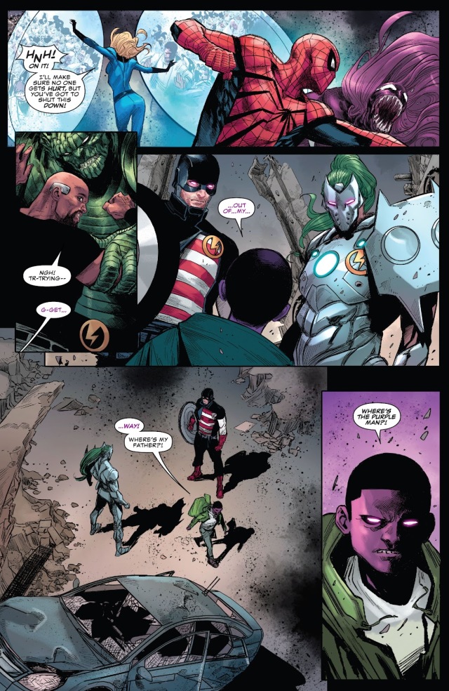 在戰場這邊,逃獄的驚奇四超人、鋼鐵人、鐵拳俠和月光騎士等人加入了戰局,但是仍然難以抵擋被紫人洗腦的雷霆特攻隊和大量的無辜平民。直到唯一先前成功被英雄們救走的紫人之子喬瑟夫(Joseph)趕來,才開始出現轉機。