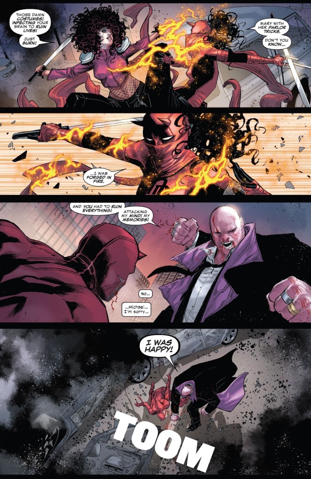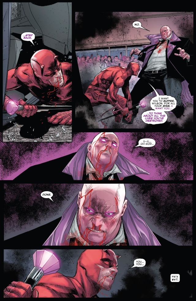 而夜魔俠在豁出一切後成功把費斯克打倒在地,但是艾麗崔——真正的殺手——卻告訴他他不該殺人。於是他終究沒有下手,而這頭怪物仍然存活於世。