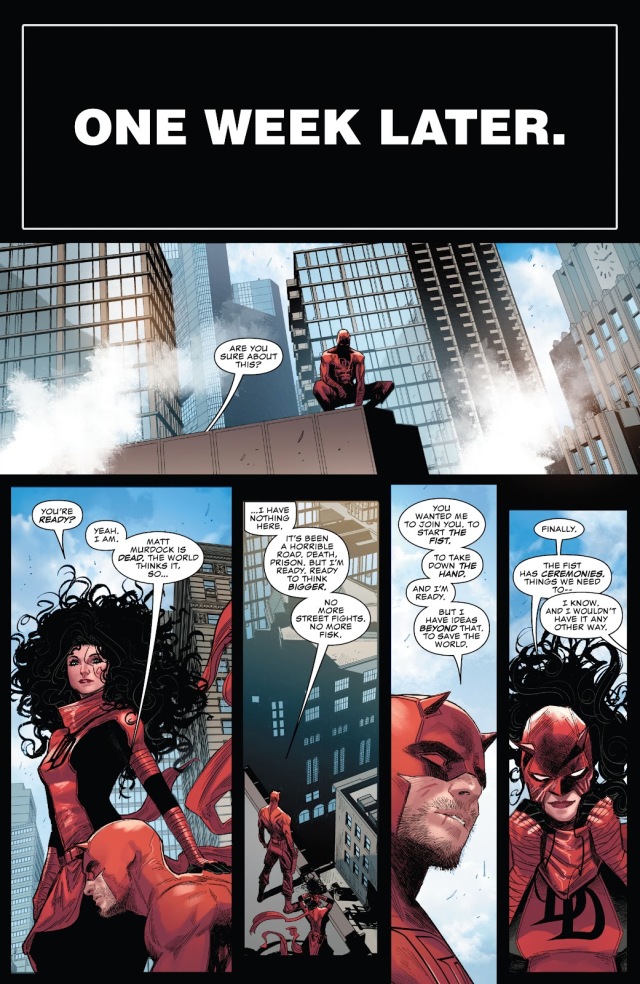 一星期後,由於一般人並不清楚麥特與麥可的關係,大家都以為麥特‧默多克已經死去,現在的夜魔俠得以把時間、精力完全放在這個身份上,並決定加入艾麗崔的組織「The Fist」來對抗手合會(The Hand)。