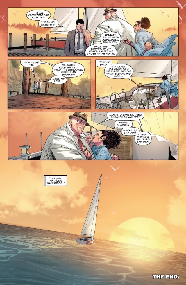 至於被逮捕的金霸王呢?他的兒子潛入押送車隊將他救出後,費斯克決定要就此退隱江湖,與新婚妻子瑪莉一起去尋找幸福。作為禮物,他要求兒子告訴整個世界他殺死了自己的父親,好成為下一任金霸王!